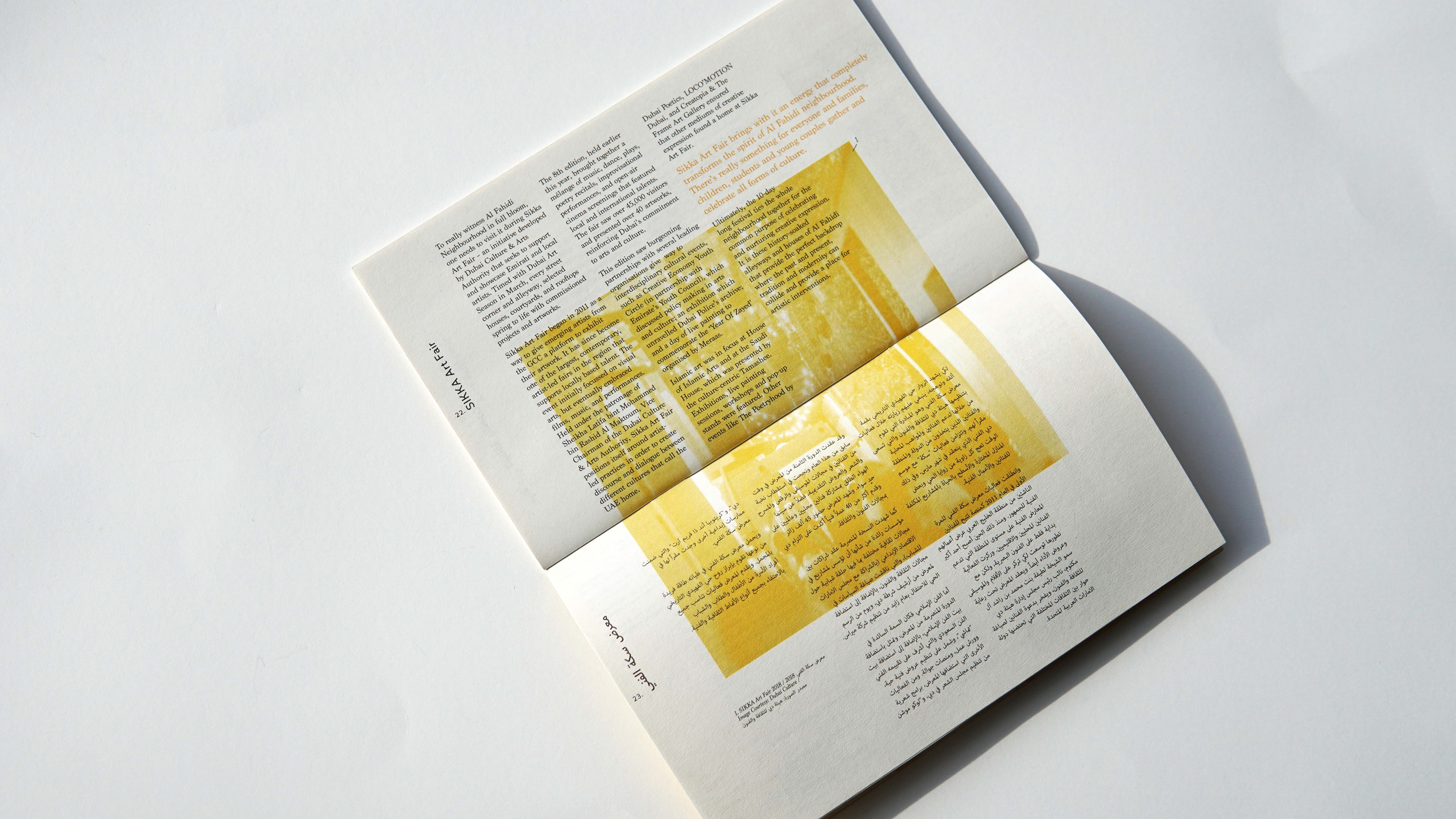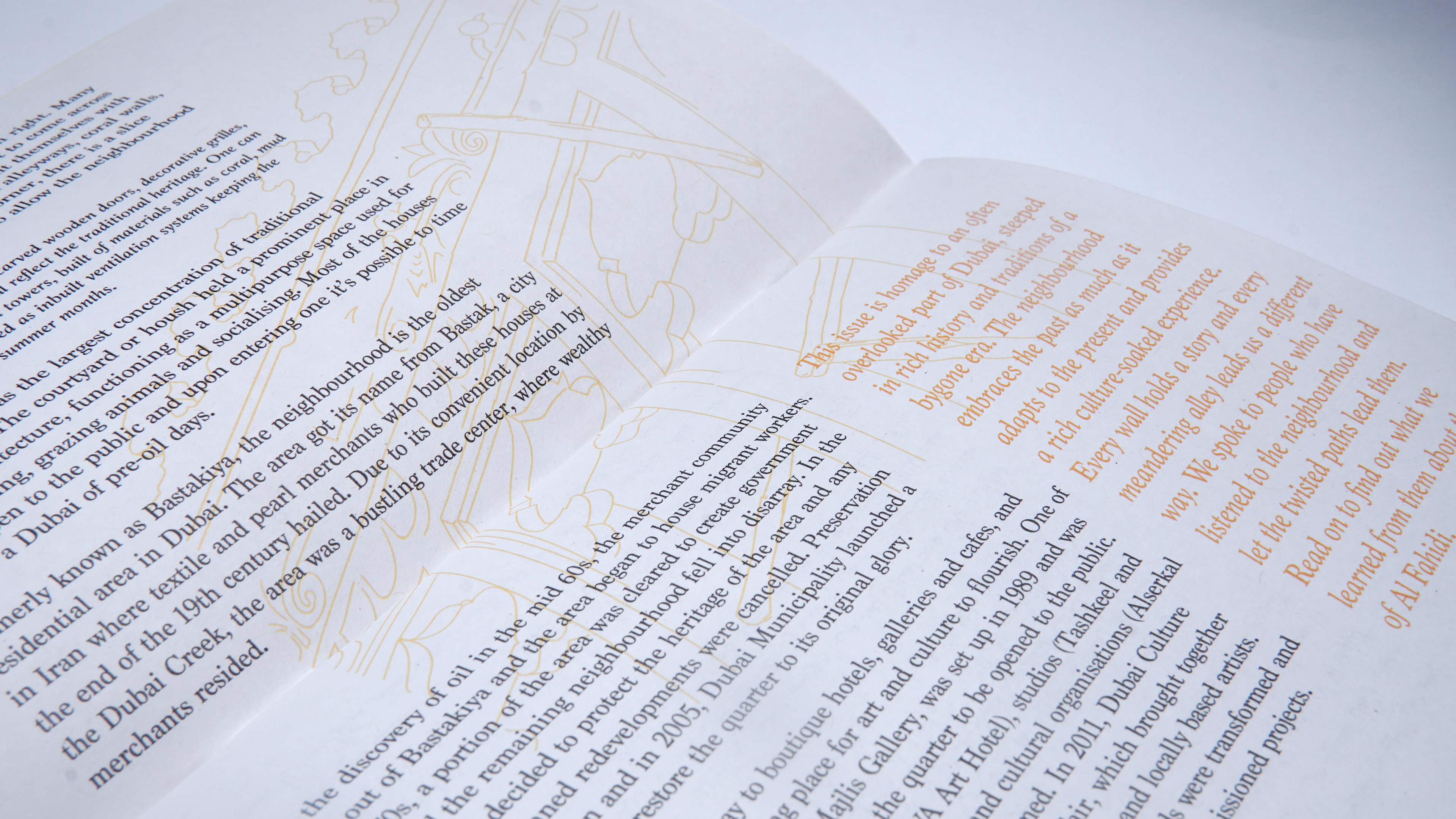 ArtMap Issue 28 This supplement features Al Fahidi Neighbourhood, a creative hub where old meets new, traditional architectures joins the modern craft. This booklet was designed to be read in its elongated format, emulating the neighbourhood’s famous wind towers Illustrator - Photoshop - InDesign