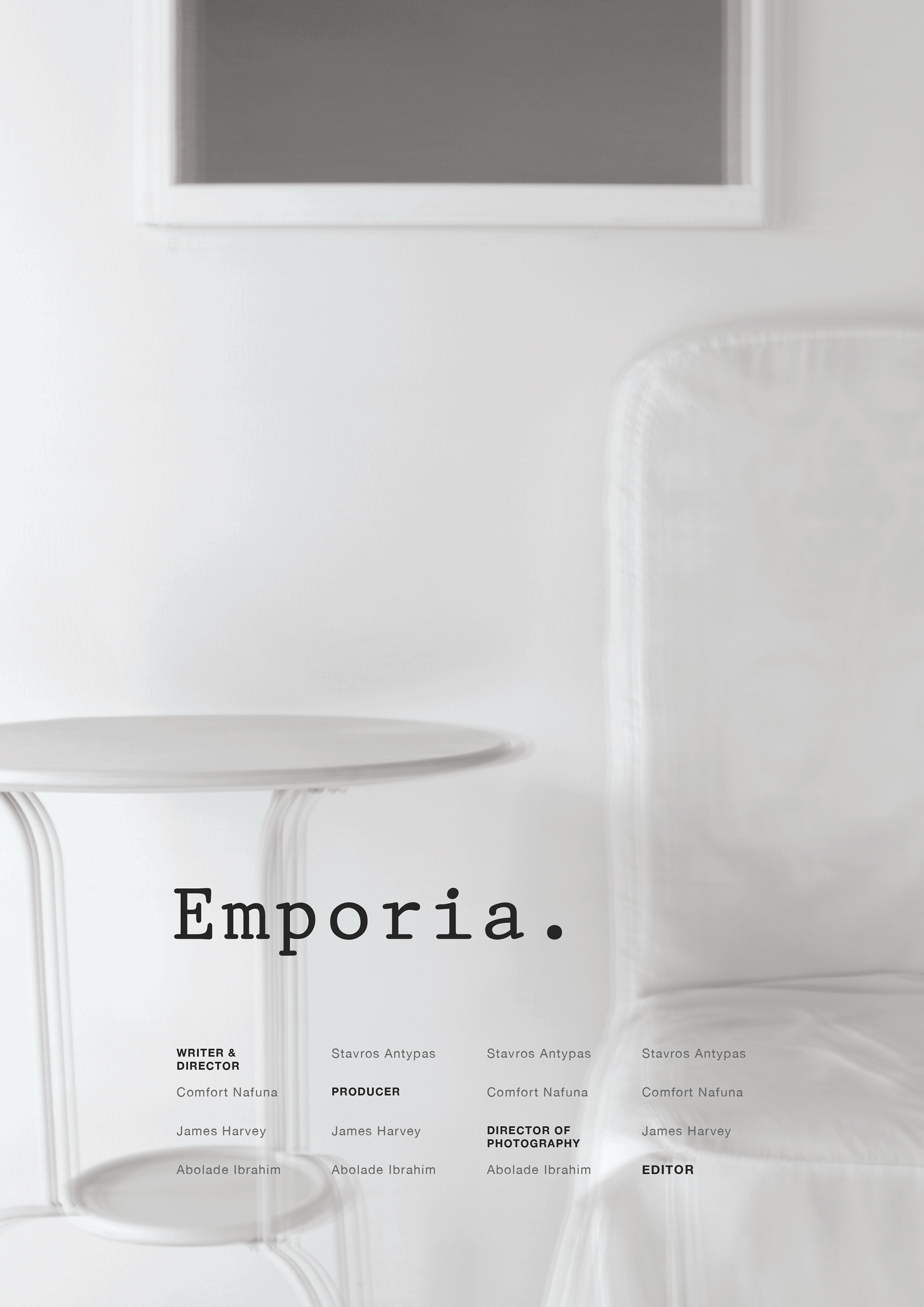 Student Project Film Collaboration "Based in the future, in a world called Emporia. Philip's disgruntled relationship with the world takes a turn when he meets Finn during mediotherapy " Photoshop